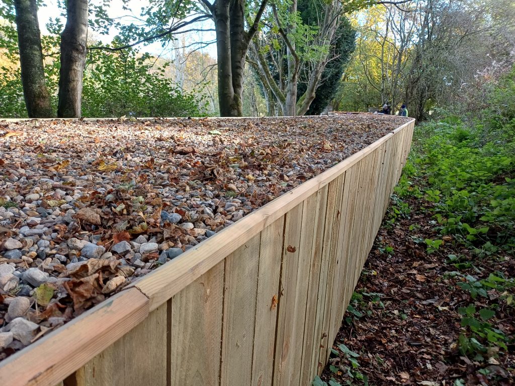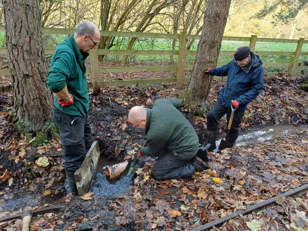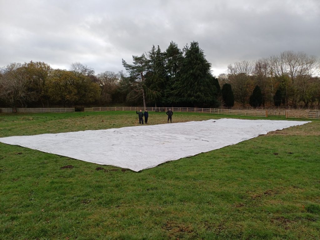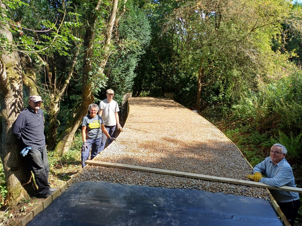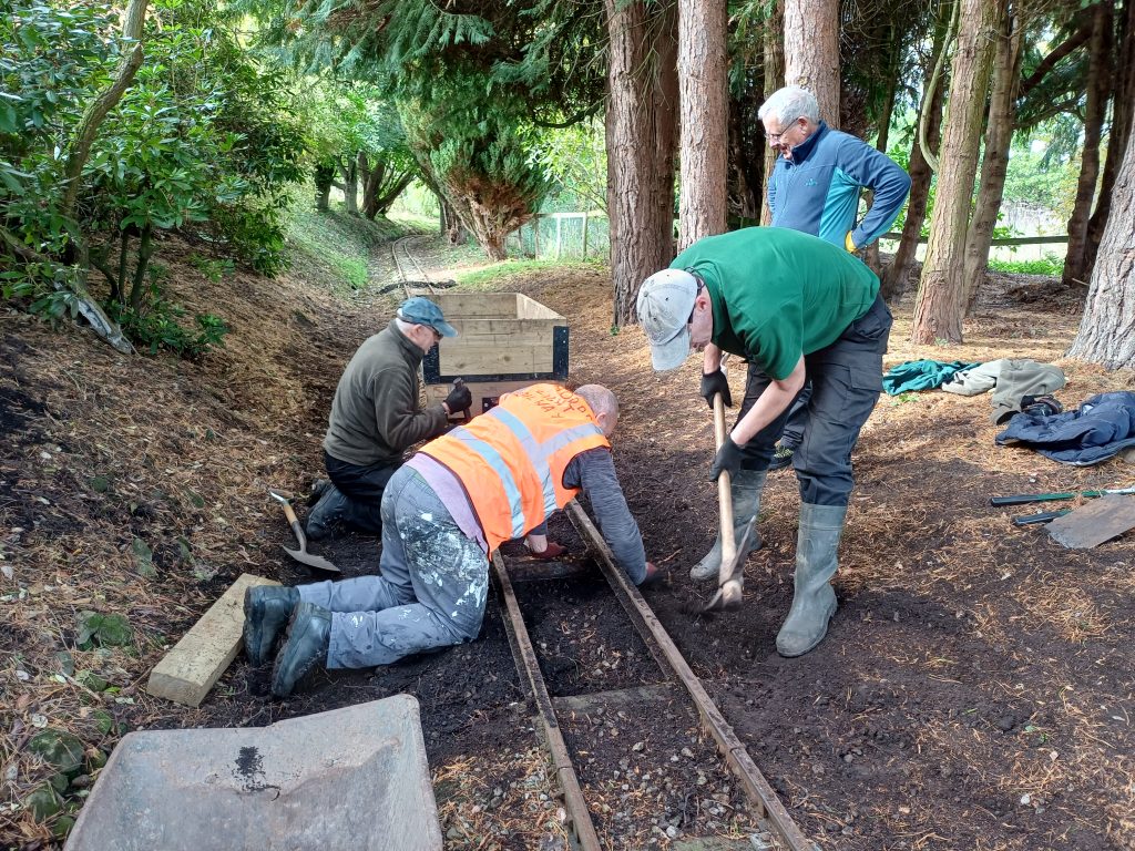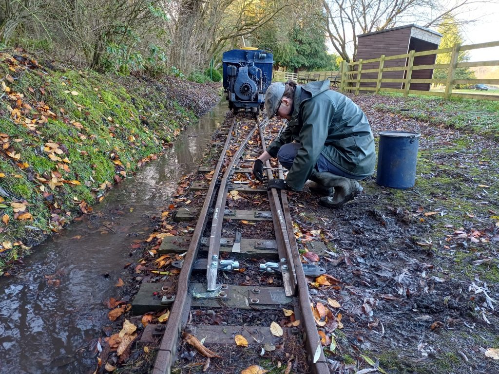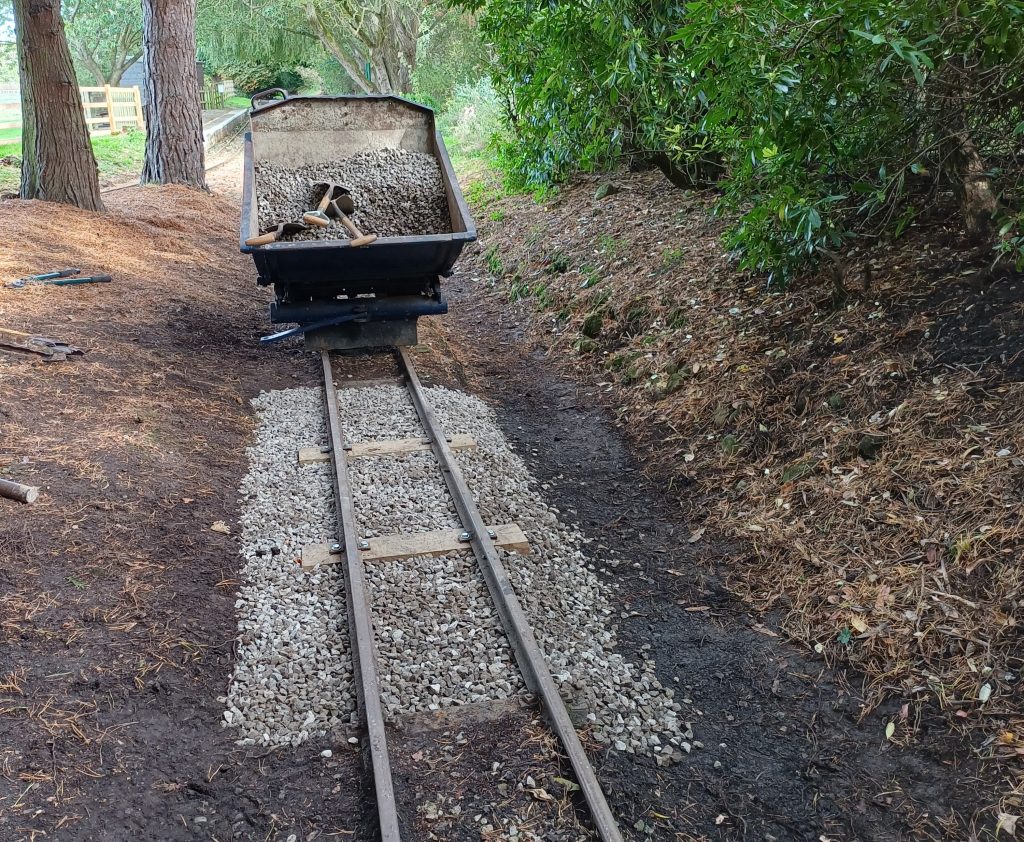 The first autumn job was the repair of the tunnel roof. We started by removing the temporary cover put on last winter – here it is laid out in the field ready to be folded up and taken off site (yes, it really is that big!)Next, the waterproof membrane and timber cladding was put on, and the roof covered with stoneThe repaired tunnel roof, ready for winterAnother winter job is re-sleepering. Here the volunteers are replacing worn-out sleepers near the stationThe ever-useful works loco, Bessie, was used to bring ballast for the new sleepers More track work, here making repairs to the point switchblades. Bessie the works engine is in use againAnother ongoing job is ditch clearing, to keep water flowing and not flooding the track. This year we are trialing a section of pipe, to test flow capacity